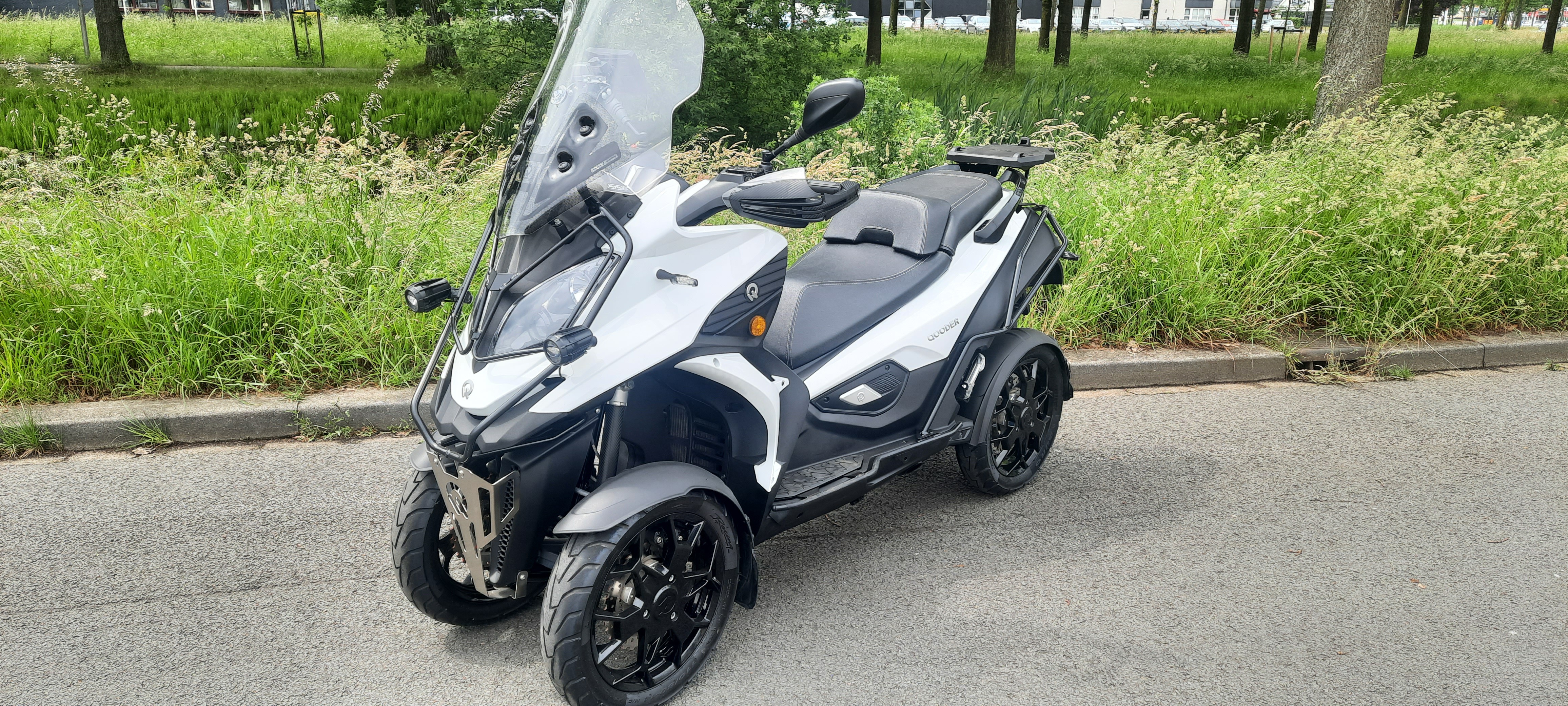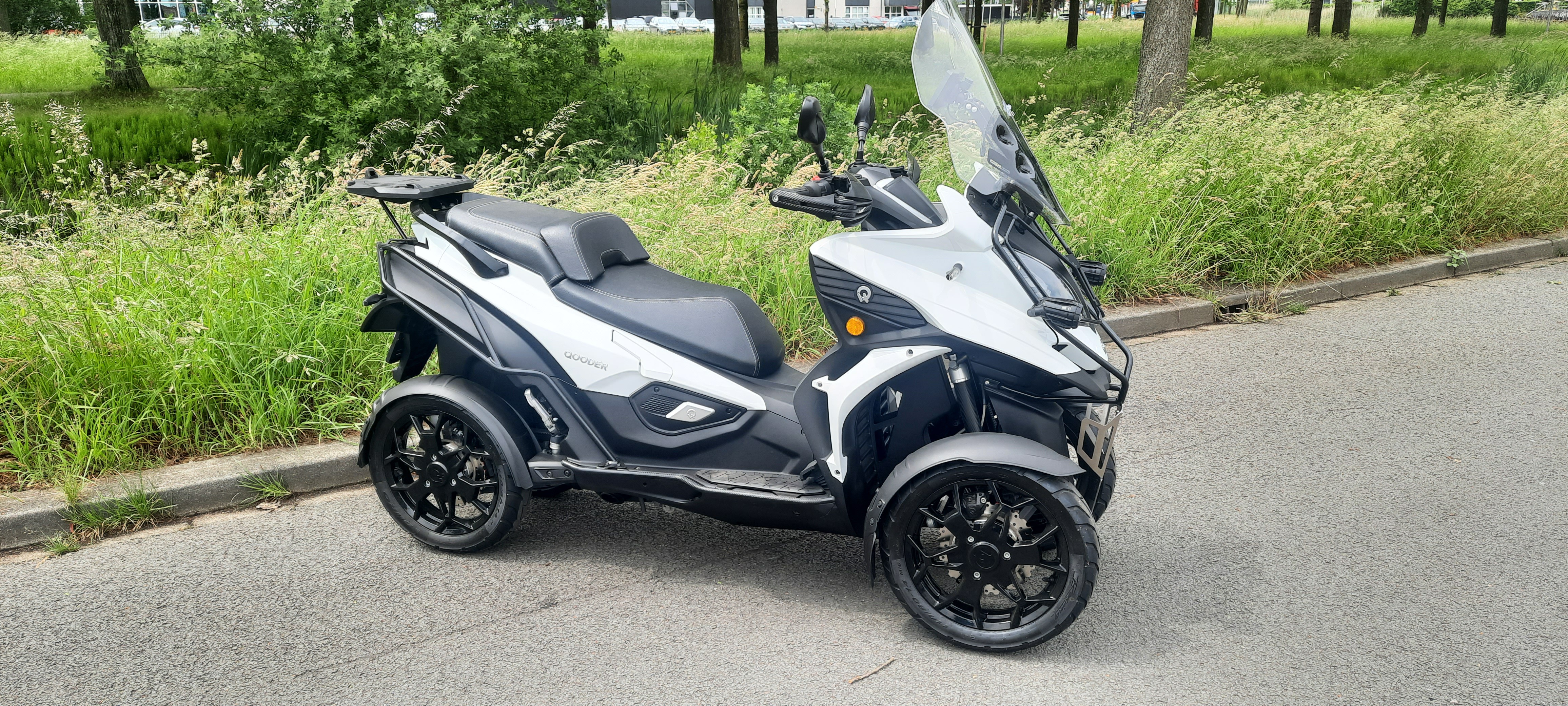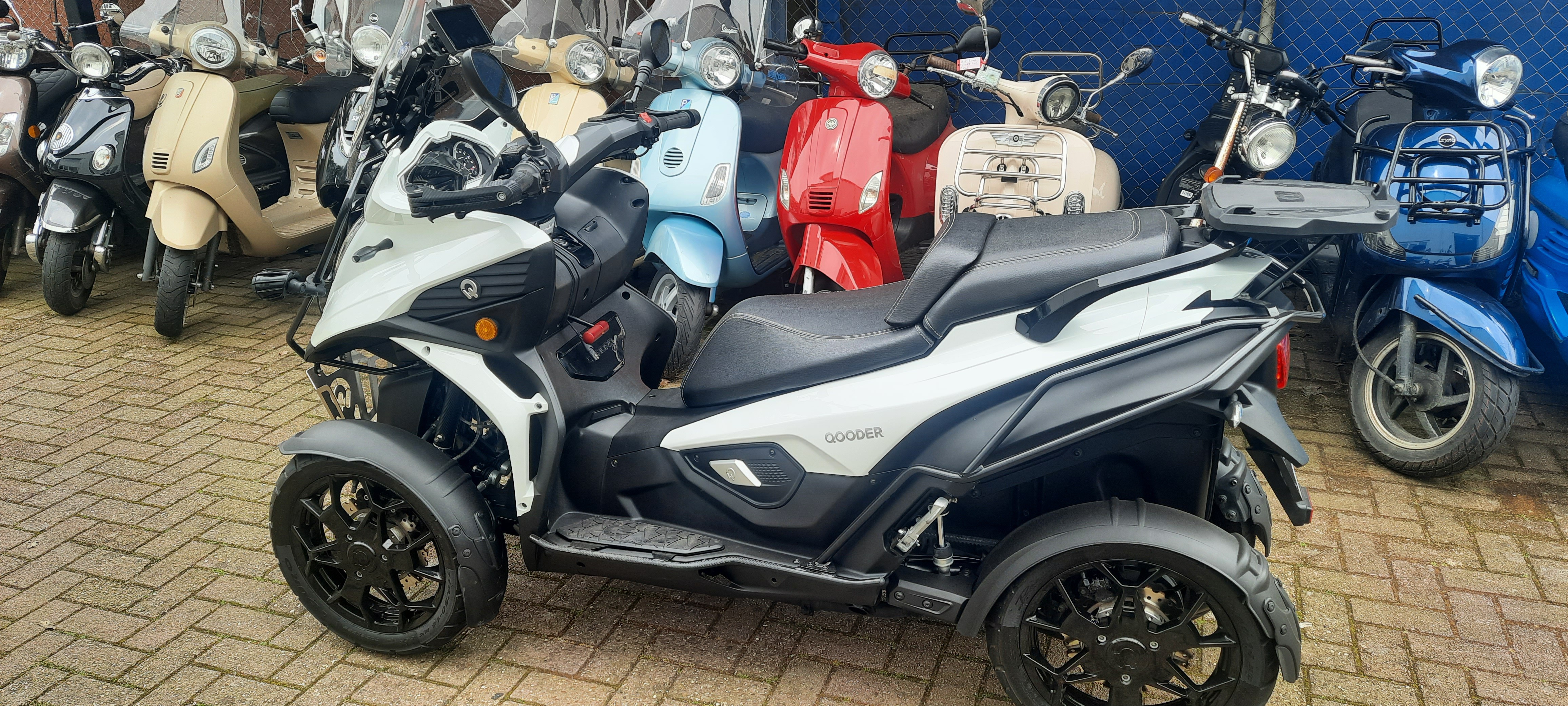 Omschrijving: De Quadro Qooder is de eerste motorscooter met 4 kantelende wielen die je gewoon met je autorijbewijs mag rijden*. Met de Qooder heb je de stabiliteit en veiligheid van 4... Quadro Qooder [WIT] Motorrijden met rijbewijs B Algemene gegevens Segment: Motorscooter Nieuw: Ja Transmissie: Automaat Kleur: Wit Onderhoudsboekjes: Aanwezig (dealer onderhouden) Technische gegevens Cilinderinhoud: 399 cc Aantal cilinders: 1 Vermogen: 24 kW (33 PK) Topsnelheid: 140 km/u Wielbasis: 158 cm Ledig gewicht: 281 kg